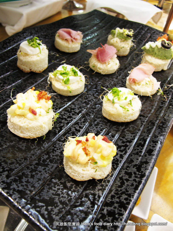麵包小點方面,白麵包切成圓的,略略烤過,上面放些煙三文魚、蛋沙律或蛋白,再擠點沙律醬。味道簡單,比外頭在擠眉弄眼的忌廉慕絲蛋糕更為實際好吃。芒果慕絲蛋糕做得不錯,但也沒令人有翻吃的慾望。另一款有麥片在表面的味道真彷如牛奶麥片,感覺詭異。多款撻類中試過了果撻、朱古力撻和tiramisu撻,tiramisu是蠻好吃的,可惜碩果僅存的一顆給我吃過以後也沒有再出現過。撻小小的,撻皮不厚,牛油味不太濃,感覺沒那麼膩。值得一提的是這裡的撻不是佐以忌廉,而是濃甜得讓人受不了的吉士醬,每次吃我都會先把吉士挖走。
